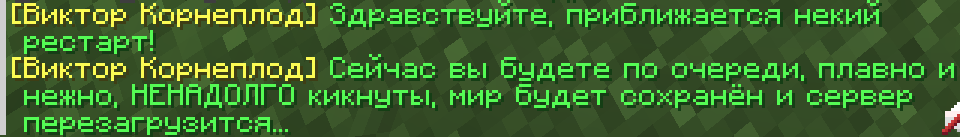 Каждые 4 часа на сервере происходит рестарт начиная с 0:00. (4:00,8:00,12:00 и т.д.) Перед рестартом в чате возникает сообщение: